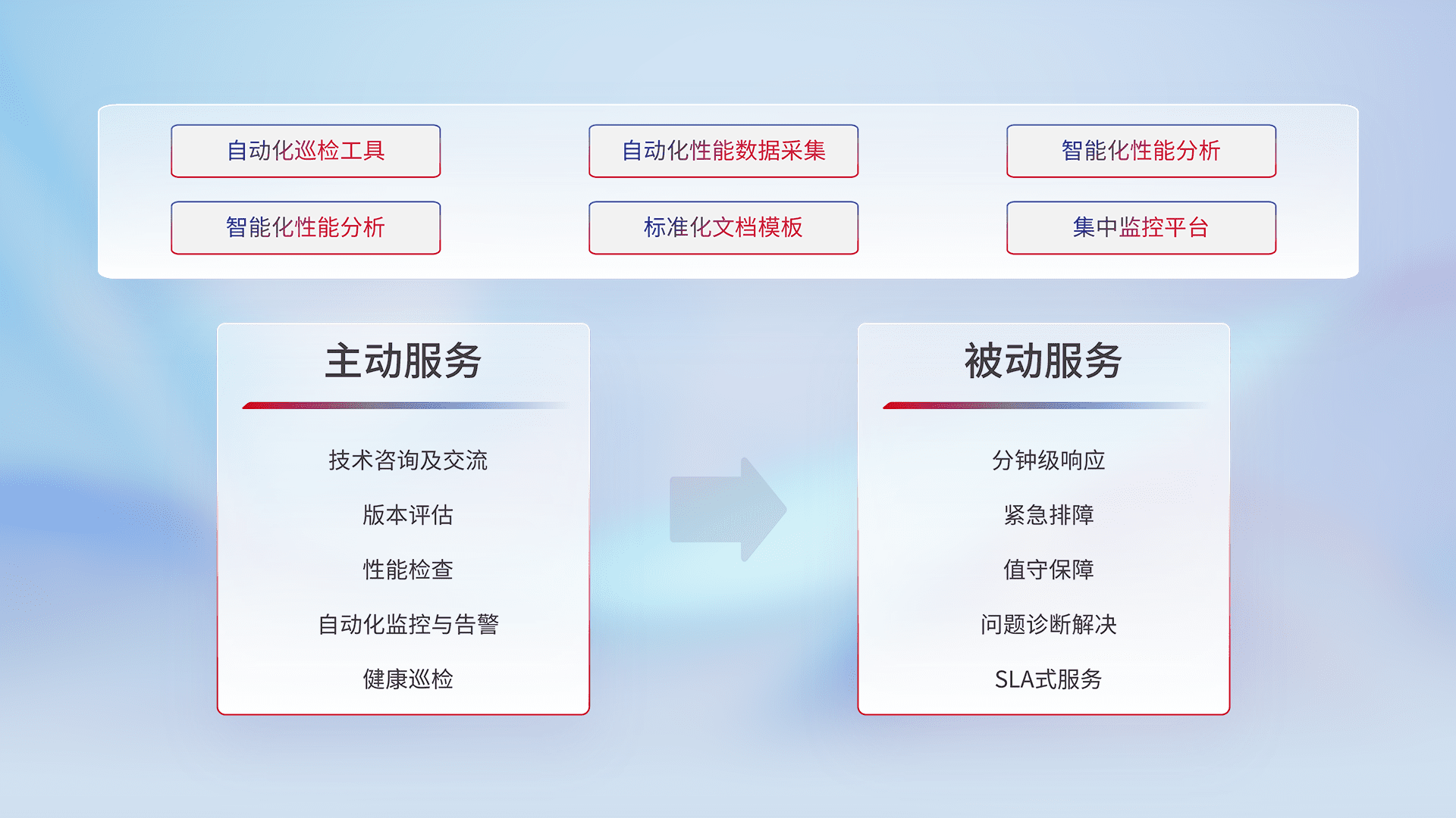 智能化工具和标准化文档,,,,保障服务质量,,,,提供主动服务(包含技术咨询、、、、版本评估、、、、性能检查、、、、自动化监控与告警、、、、健康巡检)和被动服务包含(分钟级响应、、紧急排障、、、值守保障、、、问题诊断解决、、、、SLA服务)。。